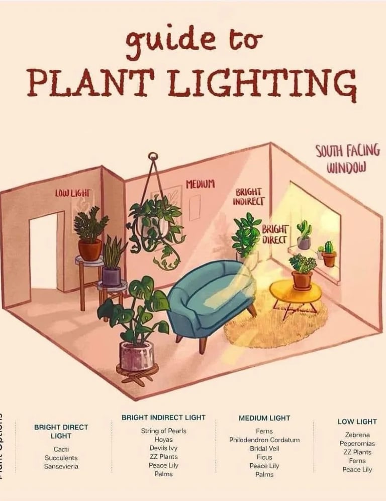 The first thing to know is that not all light is the same. Most houseplants are typically grouped into three categories: low light, medium (or bright indirect) light, and high (direct) light. Low-light plants can tolerate dimmer spaces like corners or rooms with north-facing windows, while high-light plants—like succulents—need strong, direct sun for several hours a day. In between those extremes is bright indirect light, which is where most common houseplants thrive.